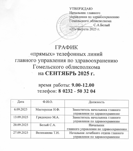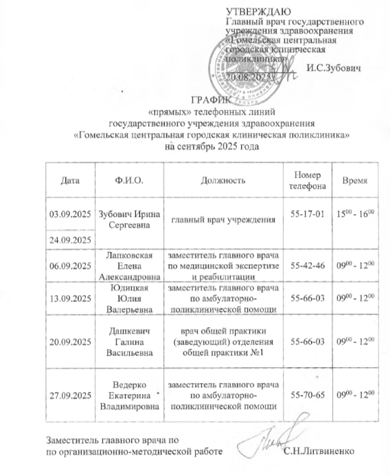13.09.2025Гайкевич Ольга СергеевнаЗаведующий отделением профилактики8(0232)29-36-2109.00-12.00
